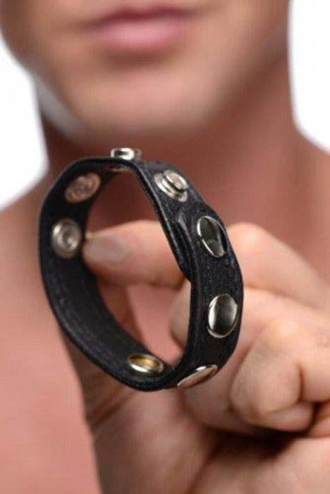 The Strict Leather Speed Snap Cock Ring is made of high quality leather. It measures 9 inches long, .75 inches in width and features 5 snap sizing slots. It effectively holds erections harder and longer, while making the wearer look good. It needs to be fitted around both the ball sack and the penis.