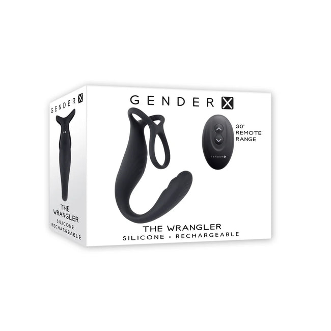 The Wrangler is an innovative 3-part toy with two powerful motors that operate independently via remote control. The vibrating center piece and facing textured oval shaft connect with a thin flexible neck while two stretchy loops bend out from the other end, creating multiple possibilities.