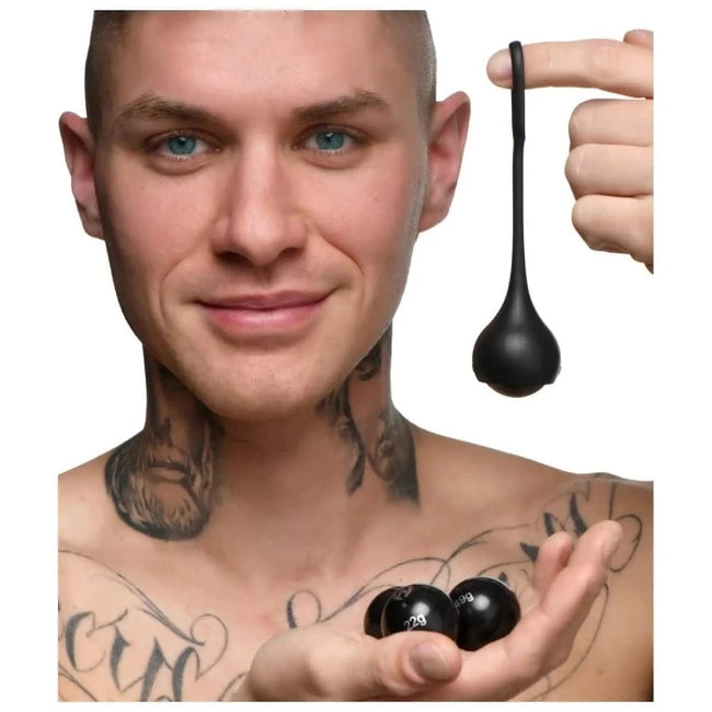 Instructions: Test your strength and endurance with Master Series Cock Dangler Penis Strap that comes with interchangeable weights. Use this dangler for endurance training to prolong your erection and give you a more intense orgasm! Place a weight snuggly in the dangler cup then take the ring strap and stretch it over your shaft until it fits tightly above the head to target your corona erogenous zone. Play with trying to lift and release your shaft to engage starting with the lowest weight and working upward once you get comfortable. Strengthen your pleasure muscles and enjoy the art of better sex and a harder cock!
