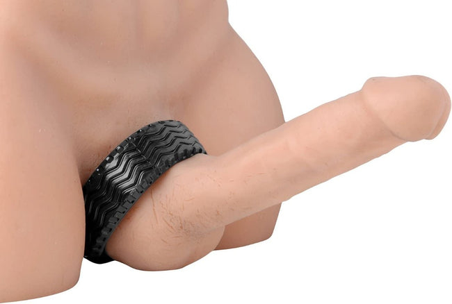 Get your motor running with this beguiling cock and ball tire. This thick and durable cock ring has the extra support and strength you need for extended sessions. The snug fit will help keep you rock hard for an extra long ride. Tread can also be used as a ball stretcher. Use your imagination.