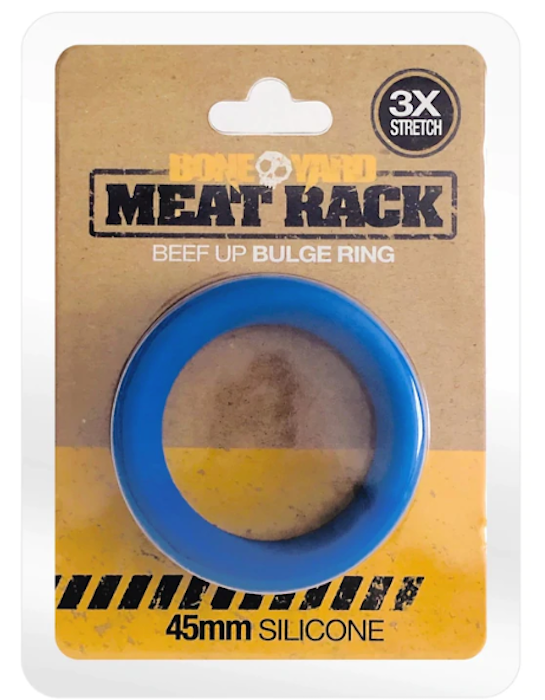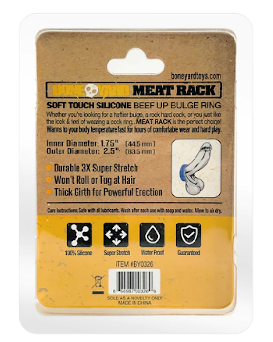 The Meat Rack - This beefy cock ring is made of 100% super stretchy silicone. The Meat Rack is made for comfort and durability with a soft feel and non-roll design. Its’ thick girth ensures a more powerful erection. The 3X stretch allows for 1 size to be used over cock, balls or both. The Meat Rack comes in black, blue, red and yellow.