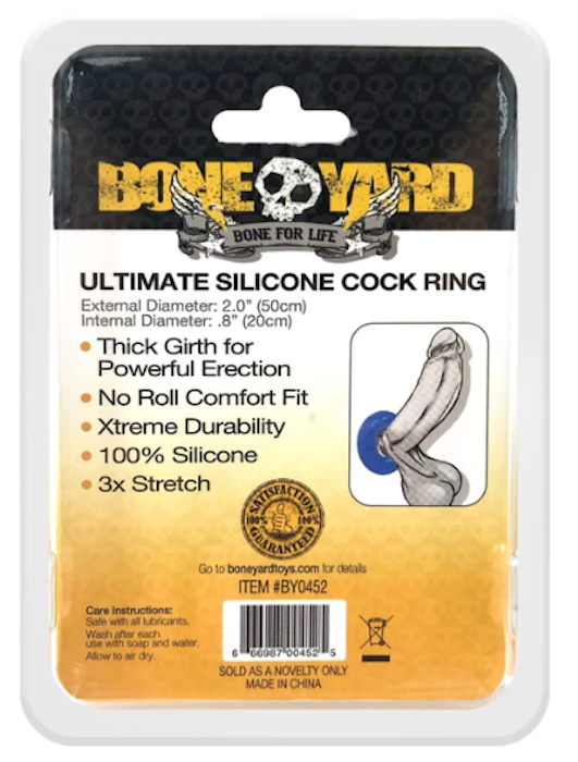 The Boneyard Ultimate Silicone Cock Ring is the must-have man toy for every man’s arsenal. The premium donut shaped ring is designed with superior materials and production thus increasing both comfort and lifespan. The powerful and iconic Boneyard-branded design has a sleek soft touch silicone finish and features a superior and durable stretch.