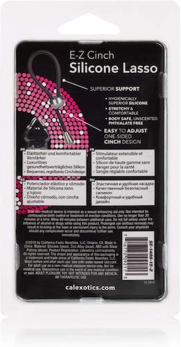 This ring is stretchy, soft and comfortably fits around any penis size. The lasso is made from a hypoallergenic, superior silicone with a Zinc Alloy plated ABS plastic bead.