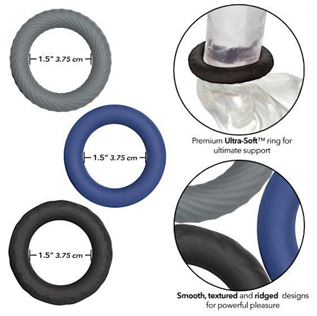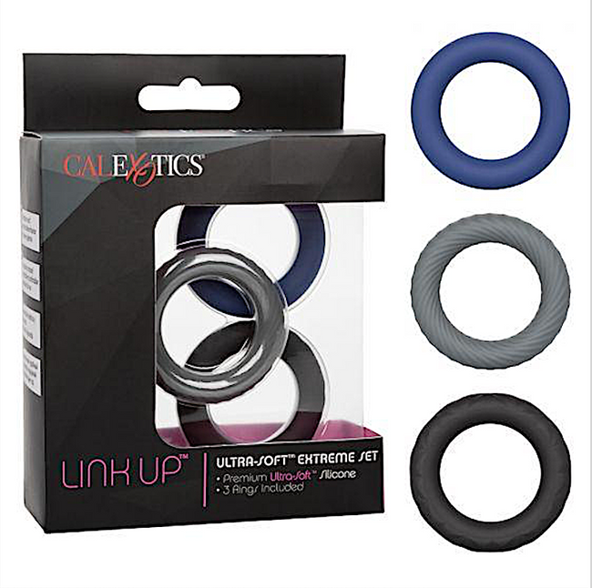 If you've been looking for a way to share even more closeness and full-coverage firmness, CalExotic's Link Up Ultra-Soft Climax Cock Ring Set is definitely for you. Not only do the three included silicone cock rings showcase the power of strategic constriction (spoiler: harder erections!), the soft stretchy design of each lets you experiment with various positions, like base and balls together, shaft alone or scrotum only. You can wear, one, two or three at once, whatever suits your scene!