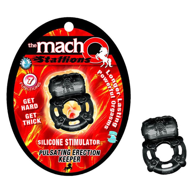 Wear the Macho Stallions Pulsating Erection Keeper as you would any penis ring. Switch on the removable waterproof vibrator inside the large textured clitoris bumper and hear her reaction when it bumps up against her clit! The textured clitoris bumper on this sex toy is enough to drive her wild alone. Experiment and try thrusting with the bullet vibrator in the "on" or "off" positions!
