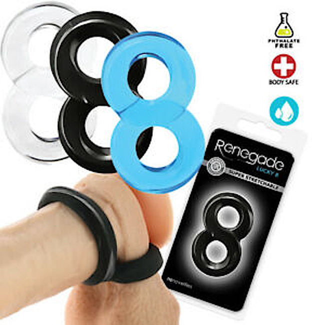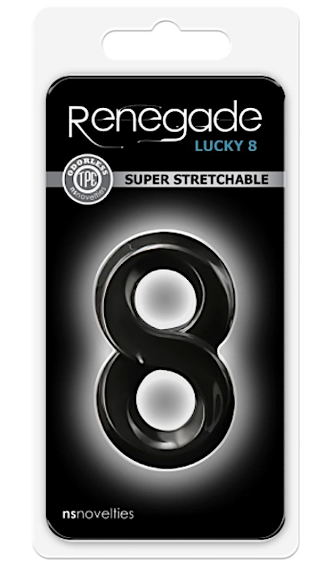 You get Pleasure and Performance with Renegade Infinity Ring. Renegade rings are performance driven, odorless TPE rings that are super stretchy, never sticky and available in assorted colors,shapes and sizes. Straightforward, super sexy and extra user friendly, the Crazy 8 comfortably enhances erection strength, helps improve stamina, and, most importantly, increases pleasure for both of you. Uniquely shaped into a figure 8, this dual ring holds snug around the base of the penis and balls simultaneously. Maintaining a thick, firm erection while constricting the testicles for a subtle 'tug' effect, the 8's dual design not only staves off too-soon ejaculation, but can help intensify your/their orgasm when the time finally comes.