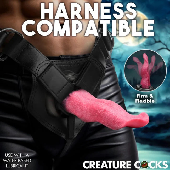 The Wolf's Lick fantasy dong from Creature Cocks offers a tantalizing journey into your wildest fantasies. This uniquely crafted dildo features a long, wavy, textured tongue, all extending from a black, realistic canine muzzle designed to devour you with pleasure. With its firm, wide suction cup base, it provides hands-free excitement on any flat surface, ensuring your rides are stable and deeply satisfying. Plus, its flanged base makes it perfectly harness compatible, letting you bring your fantasy roleplay characters to life with ease. Made from premium, body-safe silicone, this erotic toy pairs best with water-based lubricants, delivering a safe and sensational experience.