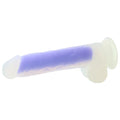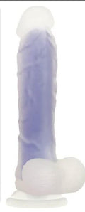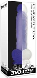 Large glowing life like shaped dildo with balls. Realistically bendable and flexible. Dual layered liquid silicone for skin feel. Glowing inner layer charges in light. Life like textures and tip. Suction cup for hands free play.