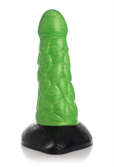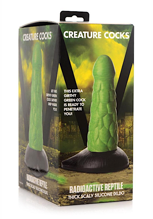 This radioactive reptile dildo is thick and scaled. The metallic green color and black base help create the perfect fantasy role-playing scenario for any dragon, reptile or crocodile scene. The wide, flanged base is harness compatible so you can pair it with a strapon harness and the bottom has a suction-cup base for hands-free riding. Use only with water based lubricant. Made of premium silicone, it is body safe and phthalate-free.