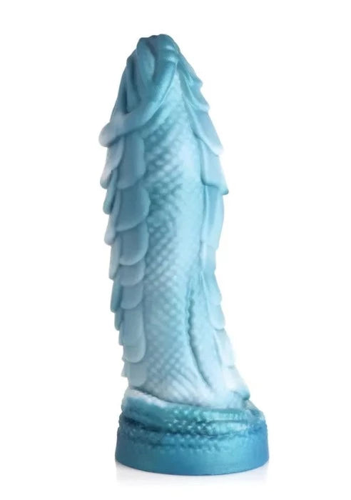 This sea serpent's rod is built different than any you've had before. The rows of dragon-scales, the textured serpent skin, the ribbed head and the gentle S-curve of the shaft all contribute to the uniqueness of this deep sea dong. Take this icy white and blue shaft and enjoy handling the heavy, girthy rod made of premium grade silicone. Each touch is silky smooth to balance out all the delicious curves and bumps you'll feel with each penetrating stroke.