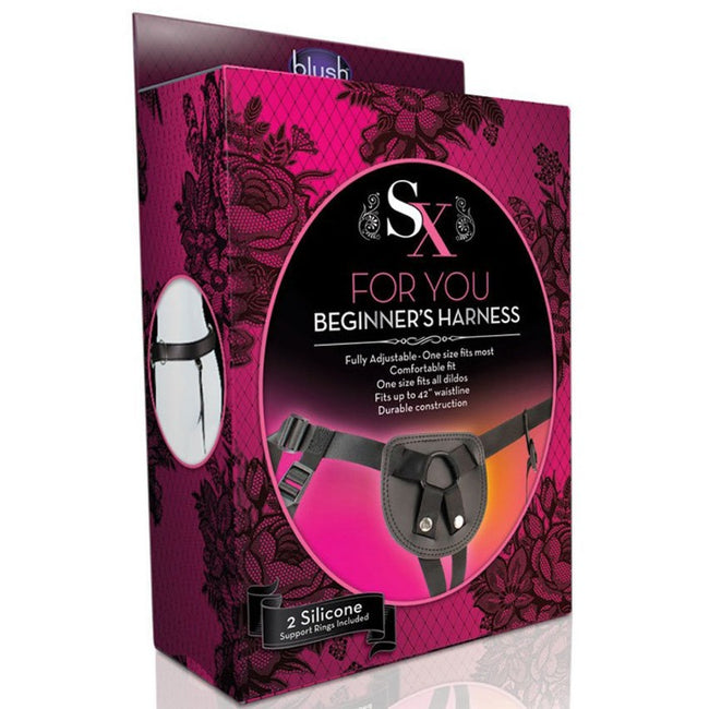 The Blush Novelties SX for You Beginner's Adjustable Strap-On Harness is an evolution in adjustable strap-on systems that comes with 2 strong silicone support rings hich attach quickly with the snap fasteners. These quick fasteners secure the support rings making this Beginner's Strap-On Harness compatible with all dildos, even extreme dildos like the Icon Brands Falcon Big Black Cocks BBC collection! Heavy duty constructed strap-on harness is for beginners to advanced players. The performance pad is constructed from smooth faux leather and adjustable nylon straps for comfortable wear. The SX for You Beginner's Adjustable Strap-On Harness fits up to a 47 inch unisex waistline.