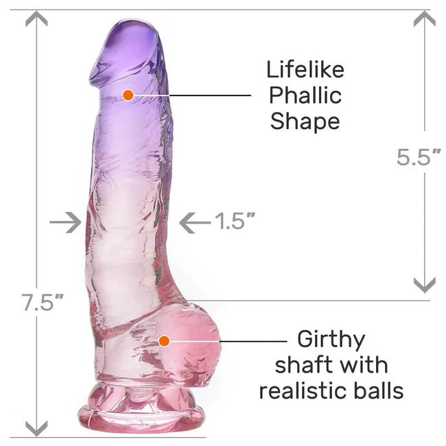 Celebrate your joy with ombré color! This eye-catching dildo starts out as deep purple at the tip, then gradually turns hot pink down at its base. Sink it in for deep, fulfilling satisfaction. 7.5 inches total length; 5.25 by 1.65 inches insertable, 8.5 inches total length; 6 by 1.5 insertable, 9.5 inches total length ; 7 by 1.75 insertable. TPE.