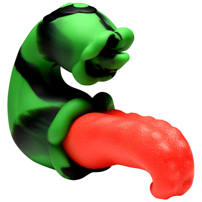 The vibrant black and green body curves so one mouth can stimulate your clit while the other extends a bright red, textured tongue for penetration! Sensational Settings: Indulge in 3 speeds and 7 patterns of clitoral vibration and vibrating and rotating tongue penetration! Squishy, Soft Silicone: The tongue is squishy enough to feel comfortable inside but also firm and tapered so it slips in easily. The texture gives it extra stimulation as it rubs you from within! Made out of premium, body-safe silicone.