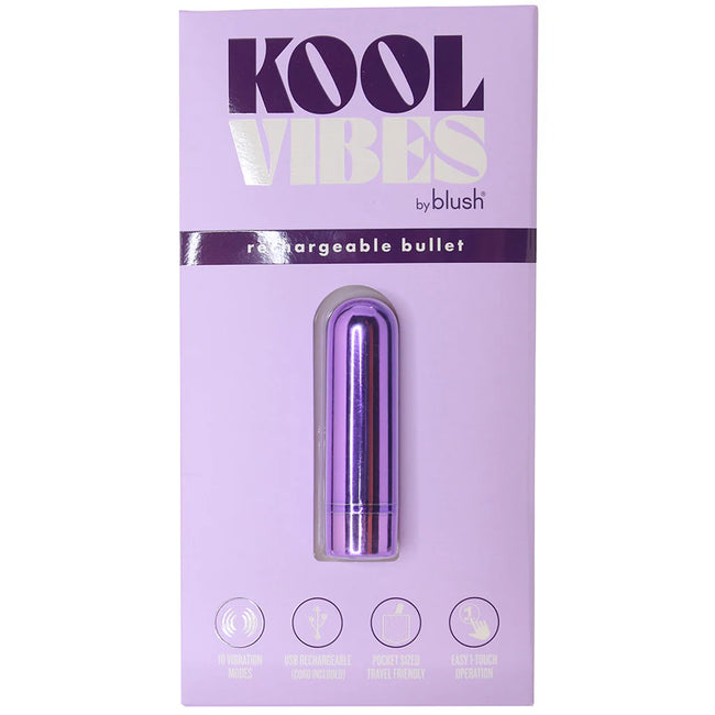 Blush's Kool Vibes Rechargeable Bullet is a small, powerful metallic vibe inspired by a classic design. Its pocket-sized shape makes it perfect for travel. It works well on clitorises, nipples, penis heads, outer butts, and more. Use with care near the anus, as it has no safety base. Choose from ten vibration modes with a button at the base. Made from body-safe, phthalate- and fragrance-free ABS plastic, it’s easy to clean with soap or toy cleaner. USB rechargeable with included cord, splash-proof but not for submersion. Size: 2.5" length, 0.5" wide.