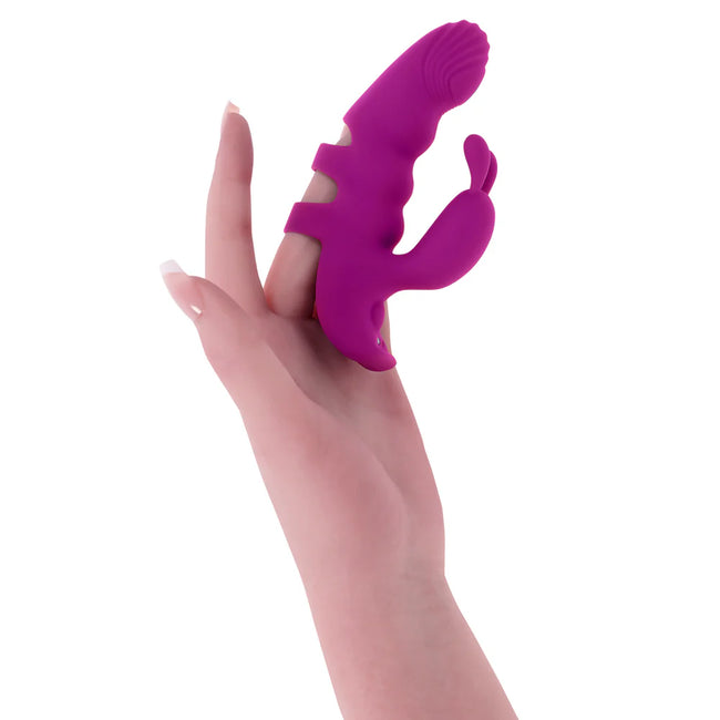 Sometimes the hottest move is to Lend A Hand! With this powerful dual-motor Vibrator, you (or a partner) can slip a finger into the main shaft and enjoy an erotic hands-on perspective. Experience focused G-Spot exploration with the angled, textured head and aim the floppy-eared bunny stimulator with thrilling accuracy as your finger navigates with a comfortable textured grip. Dual silicone straps secure your finger with ease against the textured shaft, as you stay focused on an effortless big O!