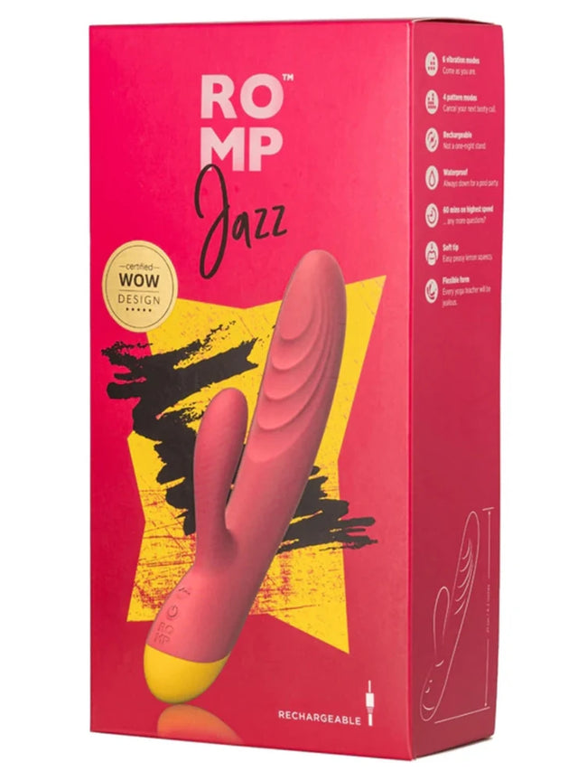 The search for the perfect rabbit vibrator is over! The ROMP Jazz is here to stimulate your G-spot and clitoris at the same time to raise your passion in a perfect crescendo. With a powerful motor, six intensity levels, and four patterns the Jazz lets you write your own blissful song. ROMP Jazz is beautifully shaped with grooves and angles that adapts to every body type for a deeply fulfilling session. The ROMP Jazz is the perfect partner to rock your world.