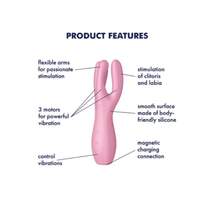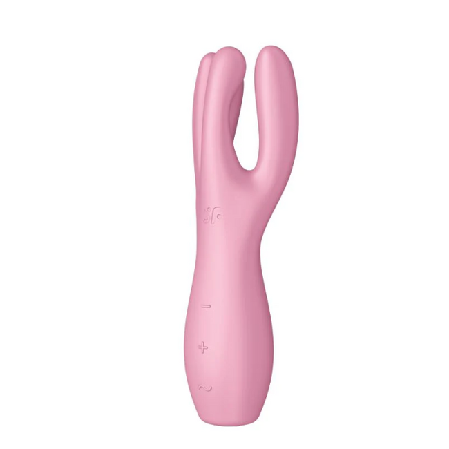 With 3 flexible pleasure arms and 3 power motors, the innovative Satisfyer Threesome 3 provides broad-area stimulation of your labia and clitoris. The soft silicone is particularly gentle on the skin. The Threesome 3 lay-on vibrator provides sensual, broad-area clitoral and labia stimulation. Ergonomically shaped with 3 rounded arms, each of which houses a powerful motor, the two outer arms pamper the labia while the middle arm rests centred on the clitoris and can be pushed down for intensified stimulation.
