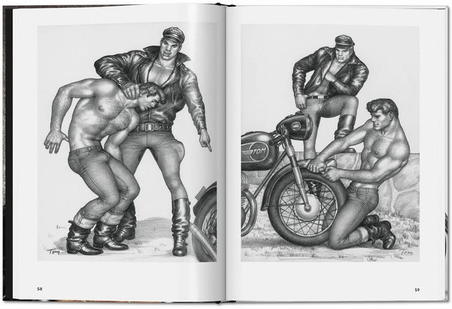 Tom’s bikers first appeared as two “Motorcycle Boys” in Physique Pictorial, Winter 1958. Another made the cover of the April 1960 issue. Bikers dominated his PP content from then on, as a nod to its American readership as much as his growing obsession. When he sought an ongoing character, a personal avatar, in 1968, he created Kake as the ultimate biker leatherman, and elaborated on his riding adventures – of every kind - through 26-panel stories. Tom adopted Kake’s gear as his own, presenting in black leather jacket, white t-shirt, jeans, and high boots to the end of his life. The Little Book of Tom: Bikers includes Tom’s earliest images for Physique Pictorial, Kake in motorcycle gear, biker panel stories, and sizzling single drawings, all packed into 192 pages of sexy, masculine men enjoying other masculine men in black leather, blue jeans, and high black boots. On bikes.