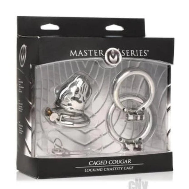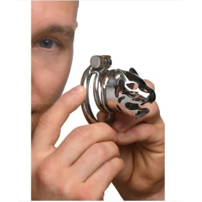 Find an elegant and unique way of caging your beast by choosing this Caged Cougar Locking Chastity Cage! The open mouth and eyes create a cum-thru tip that lets you wear it long-term. You can shower, bathe, urinate or ejaculate with it on without issue. There are three graduated rings to choose from so you can adjust the size for a comfortable and secure fit for yourself or your submissive. Two identical keys are included which lock the cock-ring and cage together so it stays secured on the shaft.