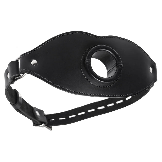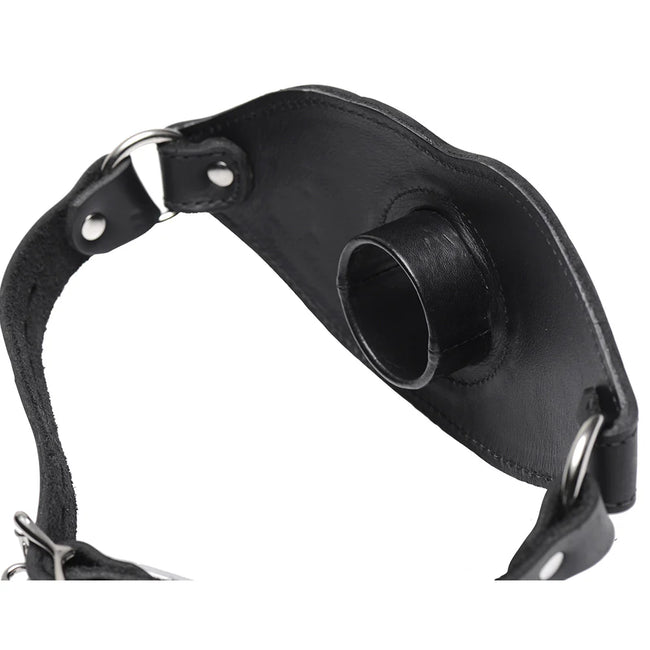 Spread their lips and keep their mouth open and awaiting your pleasure. This locking gag features a 1.5 inch diameter opening at the front, the perfect size for accepting all sorts of objects...a rolling buckle at the back locks in place easily with the addition of a standard small size lock (not included) and is adjustable to fit most any size head. The tunnel gag extends slightly into the mouth, which keeps the teeth and tongue out of the way, leaving your sub no way to resist anything you want to feed them. The gag is made of sturdy steel and genuine leather, for a high quality piece that is sure to last. Measurements: Fits heads between 19 and 26 inches in circumference, 4 inches in width Material: PU Leather, metal Color: Black Note: Locks sold separately Features: Leather Wrapped Mouth Opening, Muzzle Style Front, Adjustable Strap