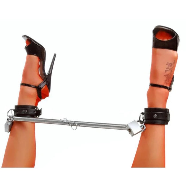 Keep your plaything in place and spread them wide with this sexy spreader bar. Made of durable steel, it has a wide range of adjustability. This bar has eyebolts securely attached to each end. Wrist and ankle cuffs can be attached to the bar as you desire, making it not only a vital accessory to your bondage play, but a warm welcome to any devious collection. Measurements: Adjusts from 23 to 35 inches in length
