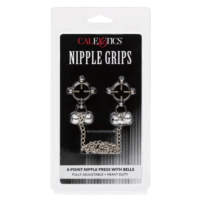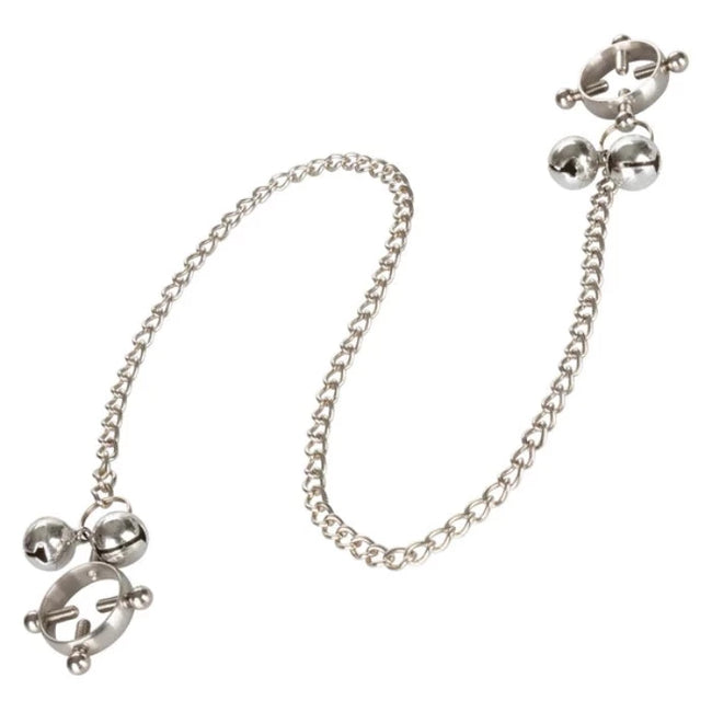 Play it tough! These fashion-forward and pleasure-inducing nipple presses with bells and connecting chain are fully adjustable with screws and bring a sensual and heavy-duty element to your playtime.
