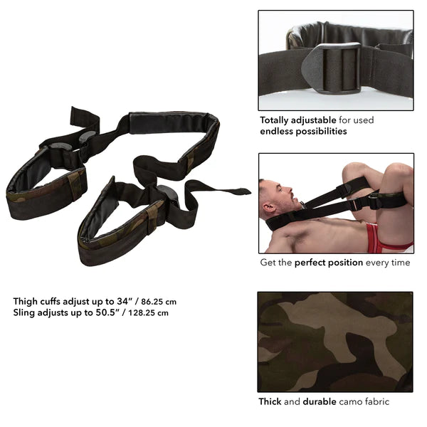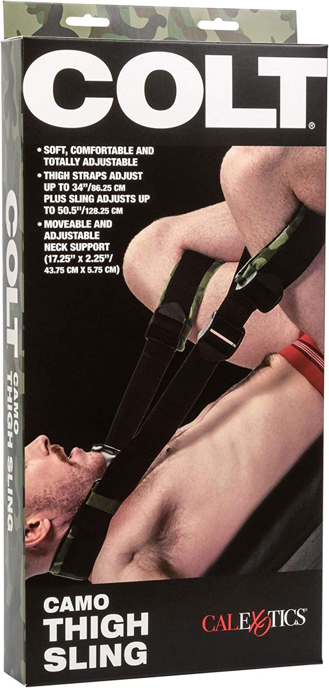 Soft, Comfortable and Totally Adjustable Neck and Thigh Straps Adjust To Perfect Positioning Easy to Use, and Easy to Release Neck and Thigh Straps to Hold You In Place Ready to play hard anytime the mood strikes and a must-have in any adventurous couple's arsenal, Colt's Camo Thigh Sling provides some very sexy and ultra sturdy inspiration to amp up the intensity of sex. As a bonus, a camo patterned Colt drawstring bag keeps everything together and ready to grab on your way out for some fun!