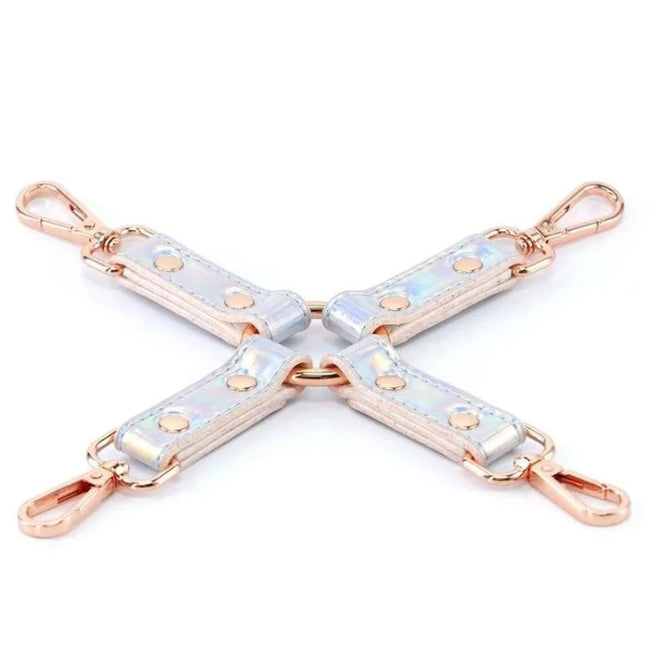 Light up the night with Cosmo's holographic restraints. Accented with Rose Gold nickel-free hardware and fully adjustable for universal fit.