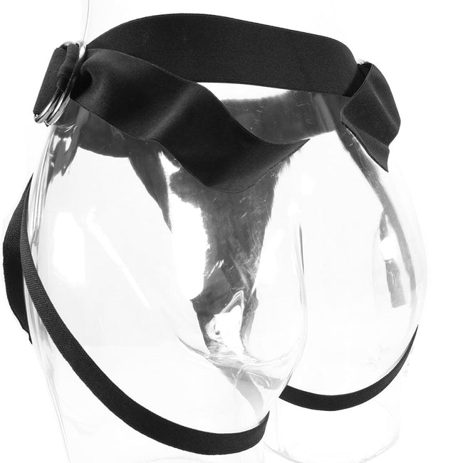 Speaking of penetrators, Johnnie features an fixed 1.75"/4.4cm O-ring set dead-center on the super-soft poly harness. It’s nice and stretchy, and will hook up with most flare-based dildos, vibes, plugs or otherwise. Behind the O-ring, an equally soft panel cushions your or their skin against the base of a chosen toy. The pictured dildo is not included.