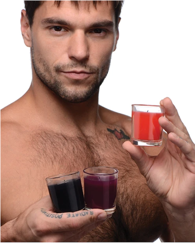 First, light the black, red, or purple candle (or all three) to set the scene. The low meting point will have the silky, moisturizing paraffin wax liquified in no time. Blow out the flame, test the temperature, then use the glass holder to drizzle and dab warm wax over chosen body parts.