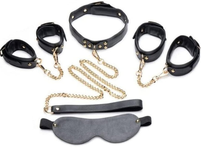 Measurements: Wrist cuffs 1.5 inch width, 12 inch overall length, adjusts from 6.5 inches to 9 inches circumference; Ankle cuffs 1.5 inch width, 14 inches overall length, adjusts from 8.5 inches to 11.5 inches circumference Connecting Chain Measurements: 5.75 inch length Collar Measurements: 1.25 inch width, 19.75 inch overall length, adjusts from 13.75 inch to 16.5 inch circum. Leash Measurements: 40 overall length, chain length 30 inches Blindfold Measurements: 7.5 inches x 2.6 inches, unstretched circumference 19.2 inches Materials: PU Leather, Metal Color: Black and Gold