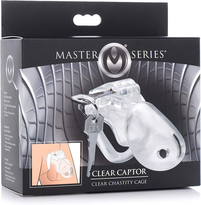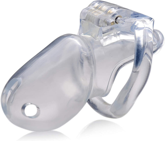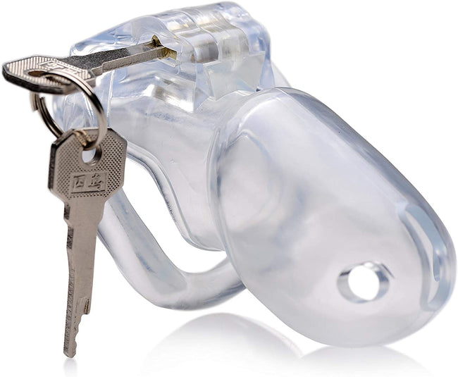 The cage itself features plenty of ventilation and a cum-through tip for the necessaries, but remains rigid and firm for a sense of security and Confidence for the wearer. The secure locking mechanism secures this cage without pesky locks getting in the way! The clear captor includes two keys, one for you and the other for your sub in case of emergencies.
