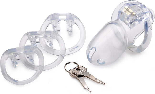 Confine your sub in this clear chastity prison! The clear captor locks your partners sexuality in clear view, preventing them from pleasuring themselves until you set them free. Made with forgiving materials for long term comfort, as well as a generous amount of ventilation holes and a pee through tip. The clear captor includes 4 ball rings of graduating size to fit all kinds of ball sacks!