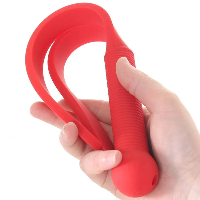 In weighty red silicone, this double tailed flogger or tawse (an implement historically used for corporal punishment) features two flat prongs on a sturdy silicone wrapped base. It's capable of softer slaps, but this bdsm beauty truly shines in the intensity department. Give it a test swing to hear the powerful whistle of those red tails - then play accordingly!