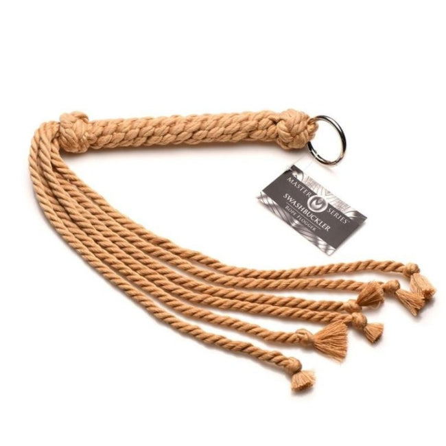 Ms. Swashbuckler Rope Flogger Tan – Floggers Take your impact and play up a notch with this 6-tailed rope whip! Made of nylon, it is highly absorbent, durable, and built to last! The knots on each end of the falls add an extra bite to each throw. Each fall is twisted so it stays tightly together and they are braided together along the handle. The firm handle keeps its shape with the help of a metal alloy core. Enjoy using this as a tool to give your lover a wicked little tap on the bottom when the flogging is paused.