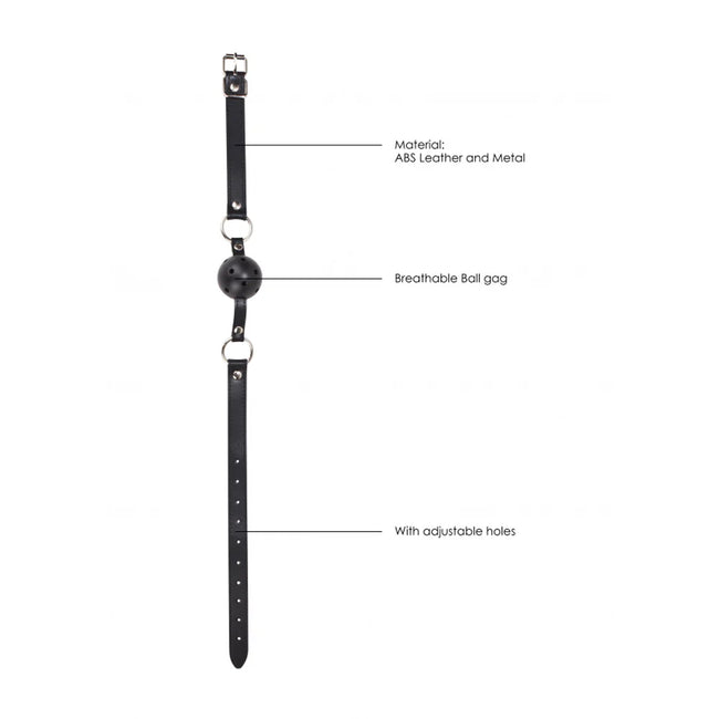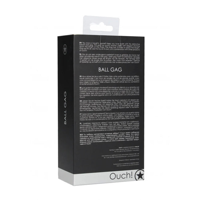 breath ball gag. This gag has quality leather straps with elegant stitching down the length of the straps. The strap has 10 holes to adjust the length. One size fits all. Use this toy on its own, or in combination with other products of Ouch!