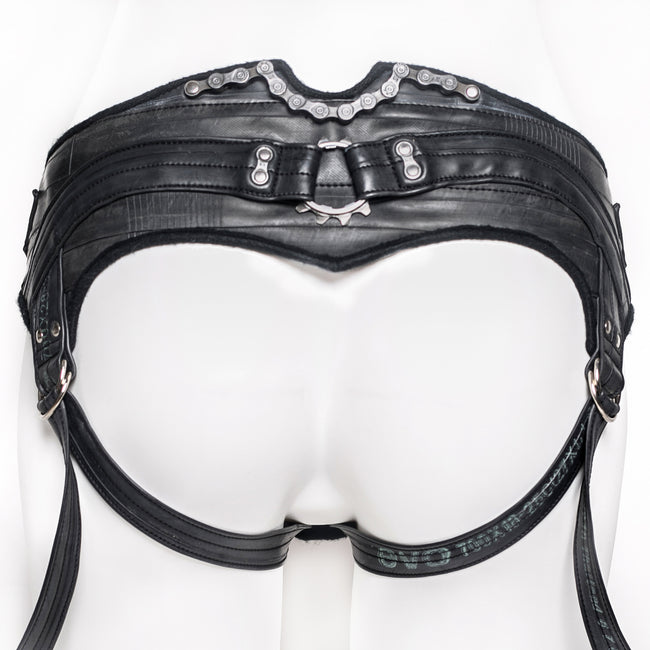 Fully adjustable, vegan strap-on harness made from re-purposed bike tubes. Lined with soft black felt, which overlaps onto the front so the edges are all soft. The back of the harness is decorated with a recycled bike chain and bike gear. The harness can be adjusted to fit hips measuring 28.5"to 53" - there are adjustment rings in the front and back, through which you pull the tube straps to tighten. The toy is held in place with a welded steel O-ring, which is easily removable with snaps. Two sizes of rings are included - 1 1/2" and 2" (inner diameter). Compatible with dildos with balls or wide bases;the straps can adjust through the front panel to fit around any shape of toy base. The harness is also compatible with other rings sizes, up to 3.5" diameter.