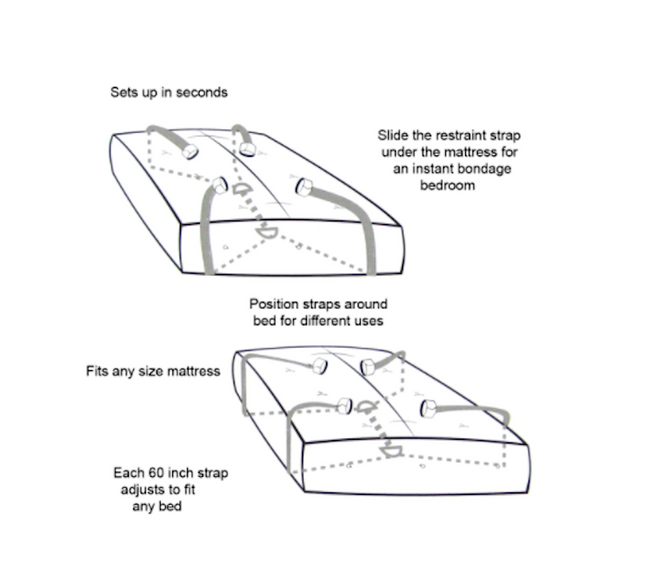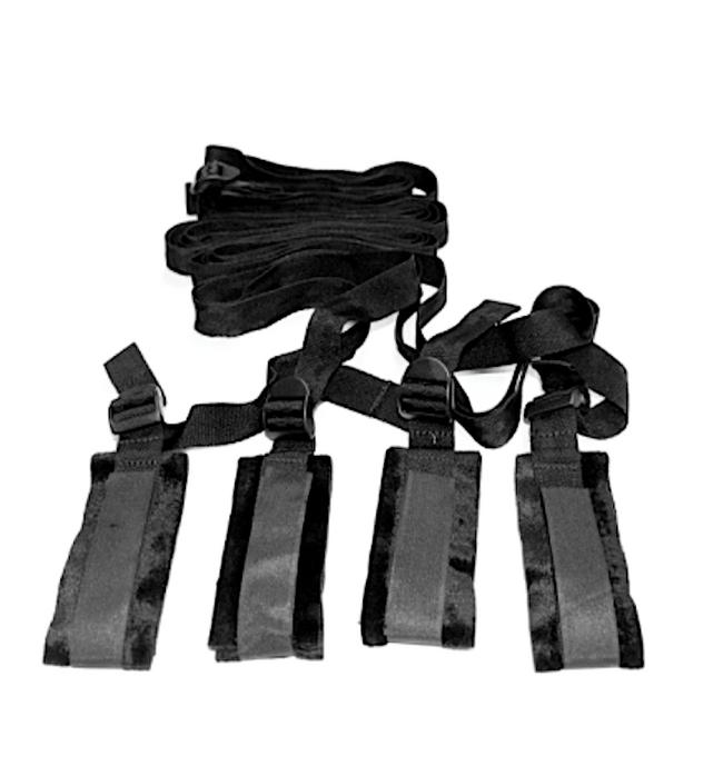 This strappy bed restraint system makes turning any size bed or couch into sex furniture easy. A one-piece kit with four furry cuffs attached to adjustable webbing straps. Simply place under the mattress or chair base and adjust the strap length. Easy! Sex & Mischief by Sportsheets have made creating your own bondage bed or bondage chair easy with this simple strap system. Making your own sex furniture is quick and easy, with minimal set-up time and maximum pleasure.