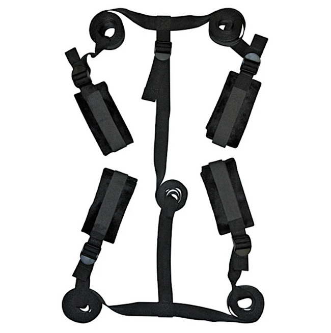 The restraint is made from nylon webbing and has five adjustable straps. One central strap adjusts the distance between the wrist cuffs and the ankle cuffs, with each cuff mounted on an adjustable strap. Simply place the central strap under the base of your chair or under your mattress and adjust the length so all four cuffs protrude from beneath. You can then place the cuffs around your partner's wrists and ankles and adjust the length of each cuff strap to secure them in place. All of the straps are permanently connected and fit into compact spaces for storage. The perfect introduction to full body bed restraints or a great travel kit for kinky couples.