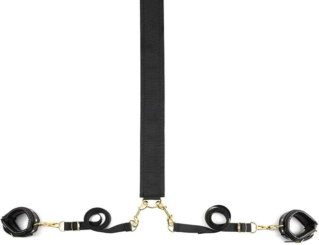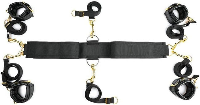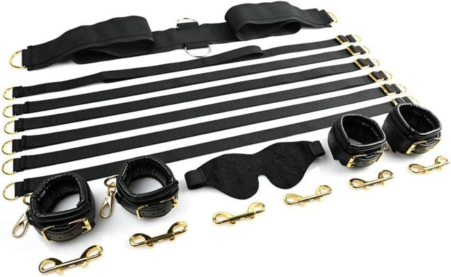 A strong nylon anchor connector strap slides under your mattress to secure six adjustable restraint straps. Four straps end in high-quality faux leather wrist and ankle cuffs with golden hardware while two are crafted with loops that promise leverage of all kinds. Position the straps around your mattress just the way you like them, tie your lover down tight, and slip the soft velvet blindfold over their eyes for a session full of surprises.
