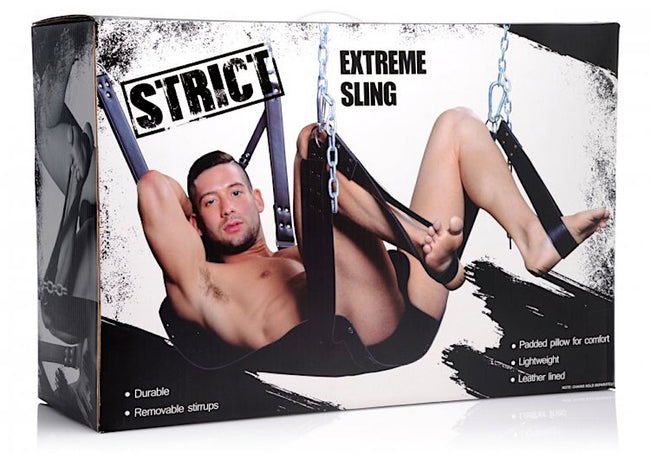 This exquisite Strict "Extreme" Leather bondage Sling allows you to access your partner while they are suspended in the air, spread open and waiting for you. The leather material is heavy, while retaining a price point that is accessible for more bondage enthusiasts! The sling allows them to lie back and place their feet in the included stirrups.