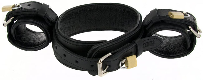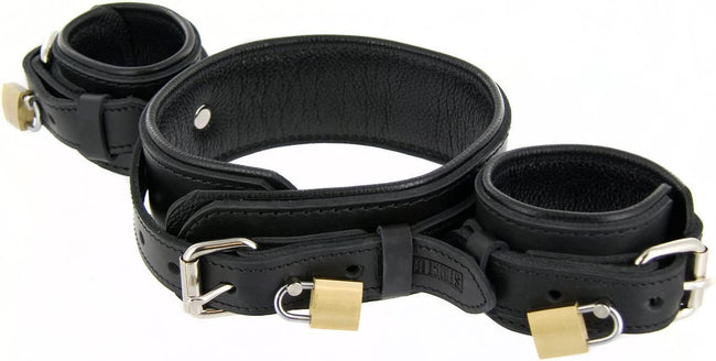 This is the ultimate in restraints and will certainly top off any fetish outfit with another dimension of sexiness. The person wearing the Wrist to Neck Restraint is forced to maintain a rigid posture while their wrists are behind their back. Rolling buckles allow you to adjust both collar and cuffs, and a ring on the front of the collar allows you to attach a leash or your favorite accessory. Keep them right where you want them in this effective, premium-quality collar and cuff restraint!