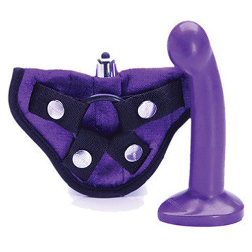 The Sport Kit has one smooth 100% Ultra-Premium Silicone Sport dildo designed for the G-Spot or prostate. The kit features a velvet harness which is comfortable, adjustable (fits hips up to 60" / 152 cm), and machine washable. It also comes with a 1.5" / 3.81 cm O-ring that can be changed for play with larger dildos as well as a built-in pocket that fits a bullet vibrator (included). The pocket holds the vibrator in place and allows access to the controls throughout your strap-on experience.