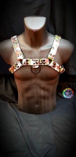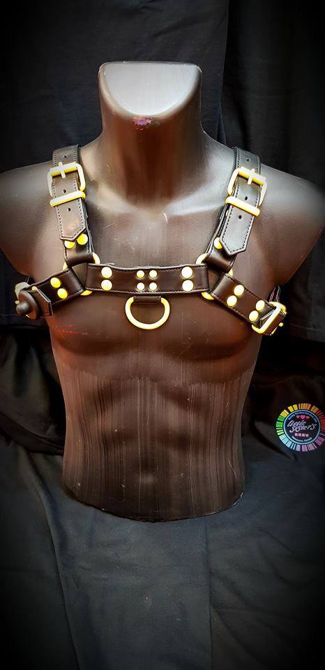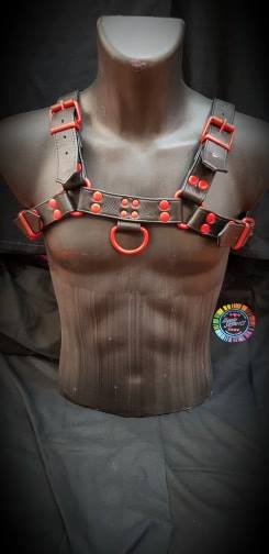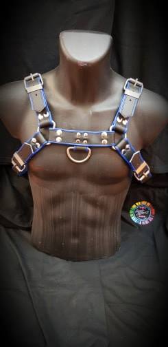 These hefty bulldog harnesses feature double layered leather: thick black cut leather over a softer, stitched garment leather, which comes in different colours. It has chunky buckles and a D-ring on the front and back.