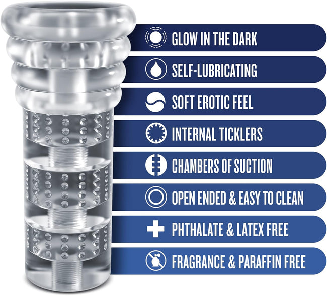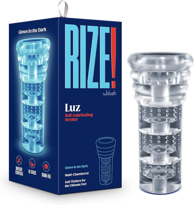 The RIZE! Luz is loaded with fun! This stroker is self-lubricating just add a little water or saliva and everything gets slippery. It also glows blue in the dark to add some excitement to your night! The Luz has soft ticklers for the ultimate feel and a ribbed inside for pressure point massage. Multiple chambers of suction create pleasurable stroking sensations. Super-soft and flexible the Luz will fit any size shaft. It is free of phthalates fragrances paraffins and latex.