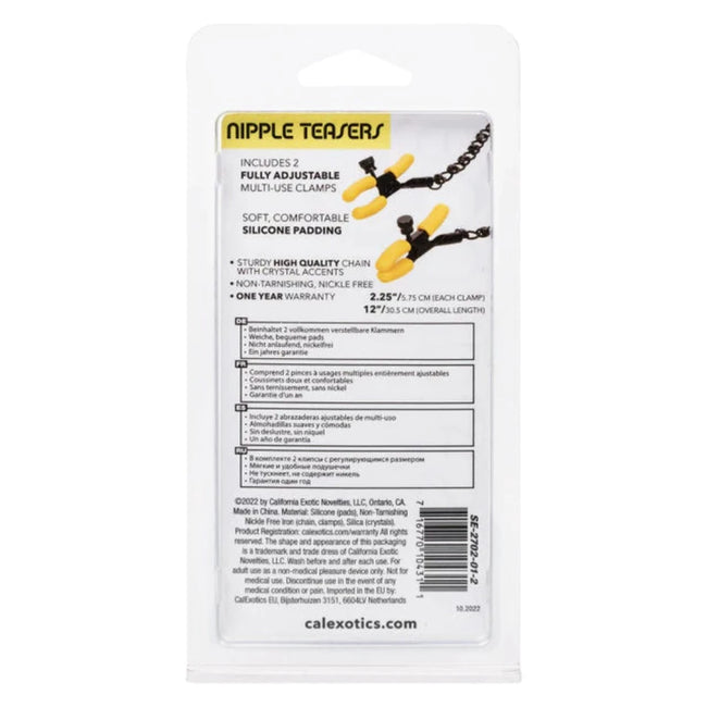 Push yourself towards endless pleasure and embrace the teasing stimulation of the Boundless™ Nipple Teasers. Explore elevated sensation with the 2 fully adjustable nipple clamps, sensual chain and sparkling crystals.