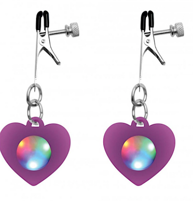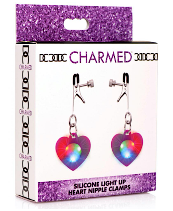 Show them the light of your heart with these Charmed light-up heart nipple clamps! Choose between 3 different light patterns and give them a show they won't forget! The purple heart and the green, blue and red lights of the LEDs are sure to leave them dazzled! The metal clamps are fully adjustable; simply turn the screw until the right pressure is achieved.