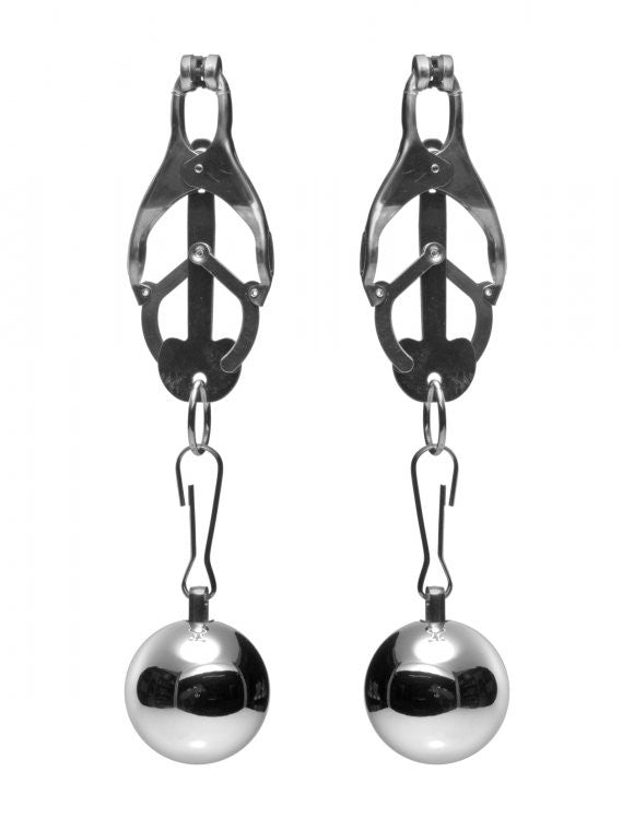 These ingenious clamps are specially designed to tighten their grip as they are pulled downward. The ends are tipped with ribbed rubber, to help retain their grip and add to the sensation. Each weight clips easily on to the end, supplying 8 oz of pull each, for a full pound of pressure total.