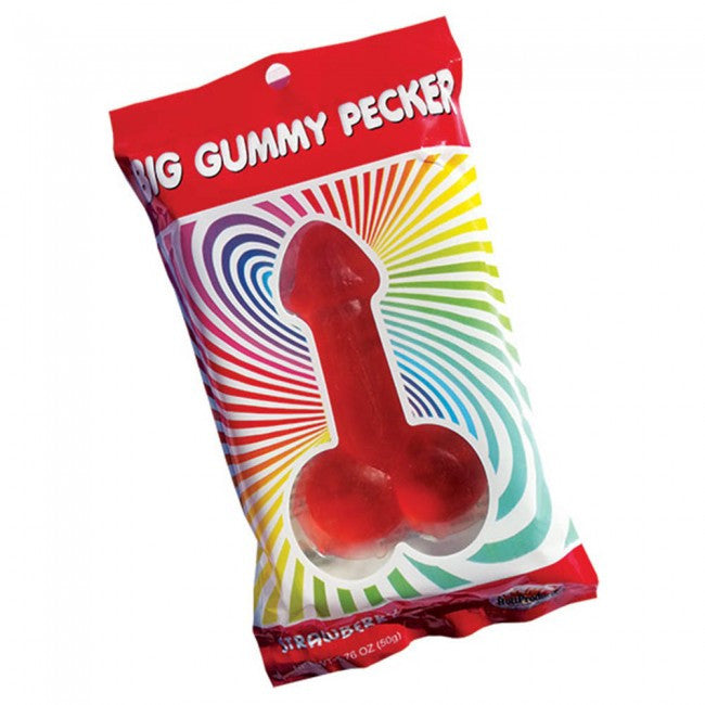 A hilarious party treat and gag gift from Hott Products, the Big Gummy Pecker in Strawberry is succulent and scandalously shaped into an erect edible pecker with balls.