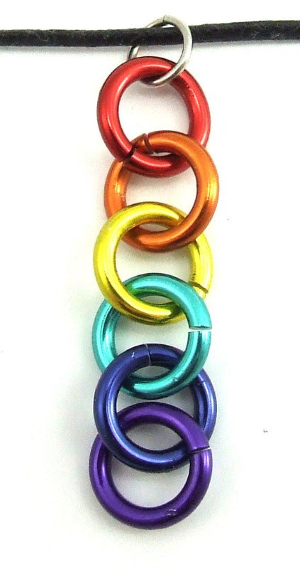 Black cord necklace with 6 rainbow coloured rings linked as a pendant. Show your pride!